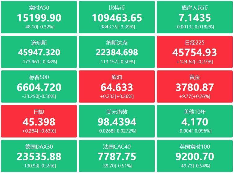 外汇:彭博美元汇率指数上涨0.6%,达到9月3日以来的最高水平;美元兑日元涨0.60%报149.80日元,欧元兑日元跌0.06%,英镑兑日元跌0.18%。欧元兑美元跌0.66%,英镑兑美元跌0.76%,美元兑瑞郎涨0.63%,澳元兑美元跌0.72%,纽元兑美元跌0.87%,美元兑加元涨0.27%;离岸人民币兑美元报7.1451元,较周三跌77点;比特币期货跌3.75%逼近10.9万美元,以太币跌6.67%报3887美元。
